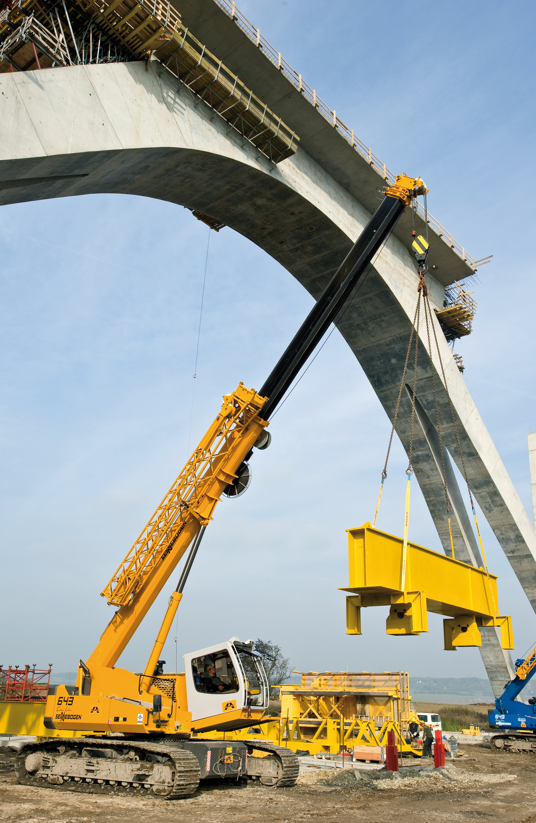 Depending on the required work height and progress in construction, the SENNEBOGEN telescopic cranes are used for a wide variety of lifting work, from the 613M and 643R, right through to the 683R. Steel parts for scaffolding, reinforcing steel or trussed rafters can be positioned, sometimes in tandem lift, safely and precisely in the desired location. Primarily in the construction of pillars, 8 ton shell parts are transported directly to the next pillar at heights of over 40 m with no intermediate lift. „The span width between the pillars is 58 m and we are often faced with difficult ground conditions. Here in particular, the telescopic crawler cranes, which can be moved under load with no problems, help us to save a huge amount of time“, states Mr. Herrmann, explaining the situation on-site.