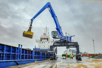 The Port of Åhus in Skåne has invested in a SENNEBOGEN 875 E material handler with 391 kW electric motor and a total weight of 165 tons: in cooperation with sales and service partner OP System, they configured a special machine with rail gantry customized to the port's existing 10 m railway track width. An old crane from 1977, whose handling capacity was no longer up to date, was replaced by the 875 E. At 550 tons per hour, the blue eye-catcher in the port of Åhus now handles around 55 % more material than its aging predecessor, whose operation was no longer state-of-the-art or economical enough.