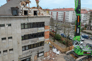 Der erste Einsatz der Maschine ist gleich symbolträchtig, soll doch die ehemalige CSU Parteizentrale in der Münchner Nymphenburgerstraße einem Neubau weichen. Gerade im engen innenstädtischen Bereich kommt es hier auf Fingerspitzengefühl an, wenn Gebäude Stück um Stück abgebrochen werden. Dabei hat die Hydraulikmaschine erhebliche Vorteile gegenüber anderen dynamischen Abbruchkonzepten wie beispielsweise mit Abrissbirnen. Vor allem in bebautem Gebiet können Gebäude erschütterungsfrei rückgebaut werden. Einzelne Fassadenelemente und ganze Gebäudestrukturen fasst die Maschine präzise und punktgenau mit der Abbruchschere oder dem Greifer und bringt die Teile sicher zu Boden. Gleichzeitig kann mit der Abbruchmaschine das Material auch gleich auf dem Gelände zerkleinert und verladen werden. Aus der 30 Grad neigbaren und um 2,70 m hochfahrbaren Kabine und mit zusätzlichen Kameras hat der Fahrer damit einen idealen Blick auf seinen Arbeitsbereich. Insgesamt bringt es der SENNEBOGEN 870 E mit seiner dreiteiligen Abbruchusrüstung auf eine Reichhöhe von 33 m und eine Reichweite bis 20 m bei komfortablen Traglasten bis 4 t.