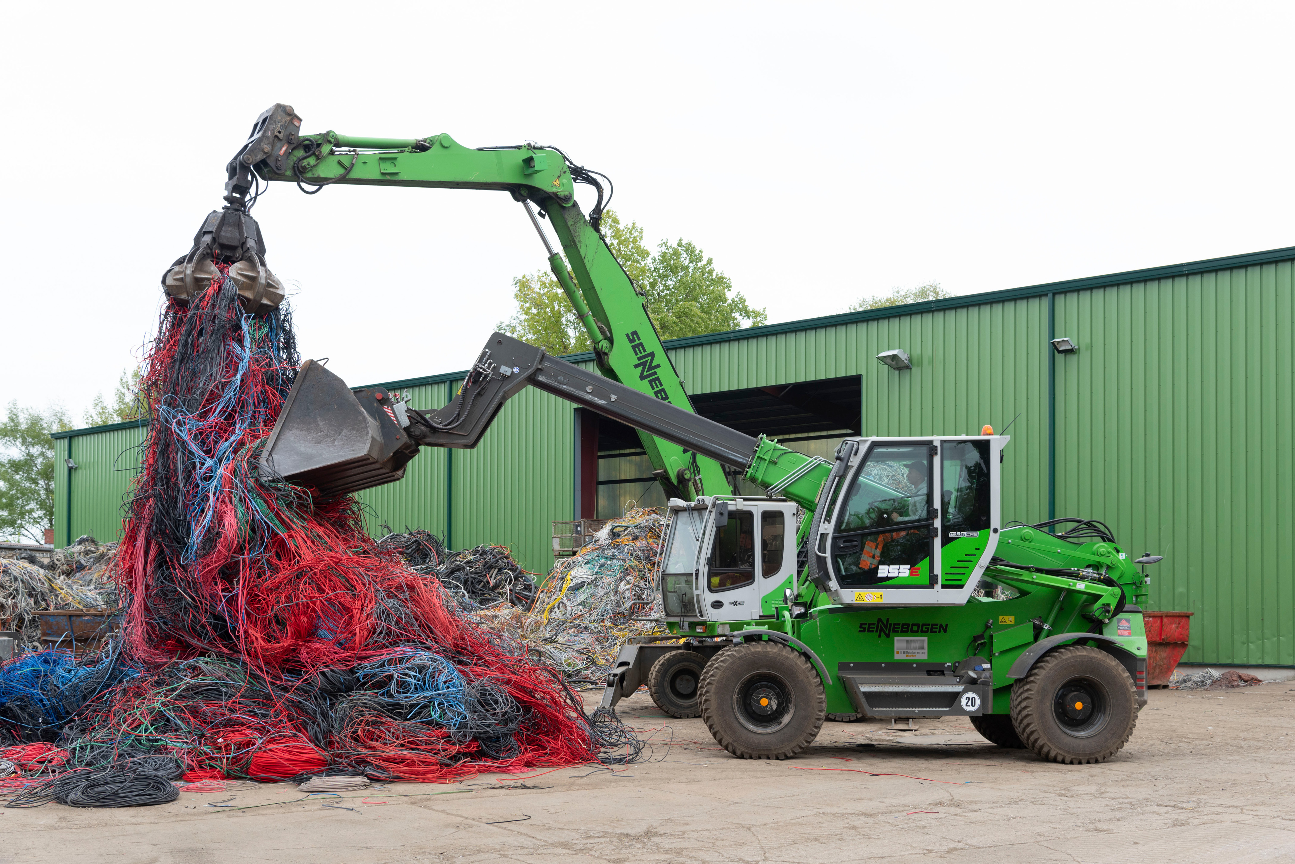 Für den 355 E gibt es somit auf dem MVM-Gelände jede Menge zu tun, und wird auch gerne im Team mit zwei anderen SENNEBOGEN Umschlagmaschinen zur Sortierung und Entwirrung der angelieferten Kabel eingesetzt.