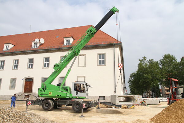 Aktuell wird die Maschine unweit vom Firmensitz in Neutraubling für den Neubau eines Straßenzuges eingesetzt. Unter der Asphaltdecke soll später ein Stauraumkanal das anfallende Oberflächenwasser und einen kleinen Bach kanalisieren. Die dazu notwendigen Fertigbetonelemente werden mit den SENNEBOGEN Teleskopkran verhoben und punktgenau platziert. Mit einer Traglast von maximal 40 t und einer komfortablen Reichweite bis zu 43 m mit angebautem Spitzenausleger deckt die Maschine nahezu alle Bedürfnisse auf der Baustelle ab. Bis zu 9,8 t wiegen die schwersten Bauteile, die hier an den Haken genommen werden, das erfordert höchstes Geschick und Präzision vom Fahrer und der Maschine.