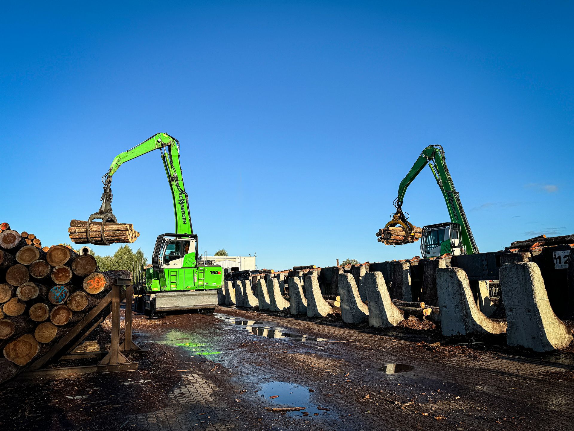 Für den zweiten Rundholzplatz entschied man sich für eine SENNEBOGEN 730 E Pick & Carry-Maschine mit speziell dimensioniertem Anhänger. Damit bewältigt das Team auch längere Fahrstrecken von 300 bis 600 Metern pro Fahrt besonders wirtschaftlich. Der Anhänger transportiert mehr Holz pro Zyklus als ein klassischer Radlader und bietet zugleich bessere Traktion, höhere Stabilität und geringere Fahrzyklen.