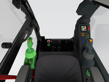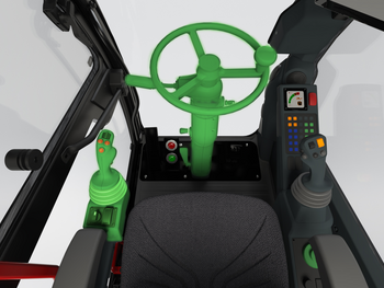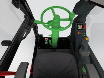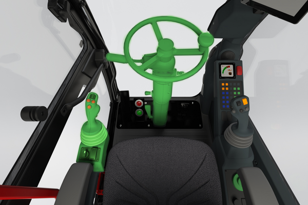 Ein wesentliches Differenzierungsmerkmal der SENNEBOGEN Teleskoplader ist die kundenindividuelle Wahl der Steuerung: Das System ist wahlweise als reine Joysticklenkung oder in Kombination mit einem klassischen Lenkrad verfügbar. Damit reagiert das Konzept auf die Limitationen bisheriger Marktlösungen, die durch den vollständigen Verzicht auf das Lenkrad oft die Flexibilität bei Straßenfahrten und die allgemeine Akzeptanz einschränkten.