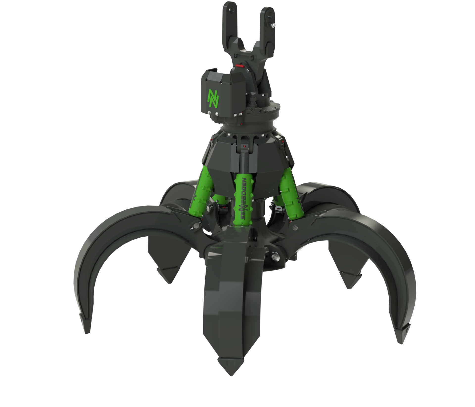 Der Greifer kann mit ein oder zwei starken Drehantrieben ausgestattet werden, je nachdem ob mehr Geschwindigkeit oder mehr Drehmoment gefordert ist. Eine robuste Blechabdeckung schützt sie vor äußeren Einflüssen. Ebenso setzt SENNEBOGEN Hochleistungszylinder aus eigener Fertigung ein, die ebenfalls gut geschützt hinter servicefreundlich zu demontierenden Stangenschutzblechen liegen.