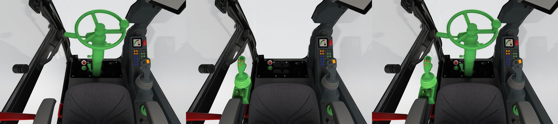 | Kombinierte Steuerung | Diese einzigartige Konfiguration von SENNEBOGEN vereint die Vorteile beider Systeme: Transportfahrten sind via Lenkrad möglich und der Wechsel auf die Joystick-Steuerung erleichtert präzise und ergonomische Arbeitszyklen. |